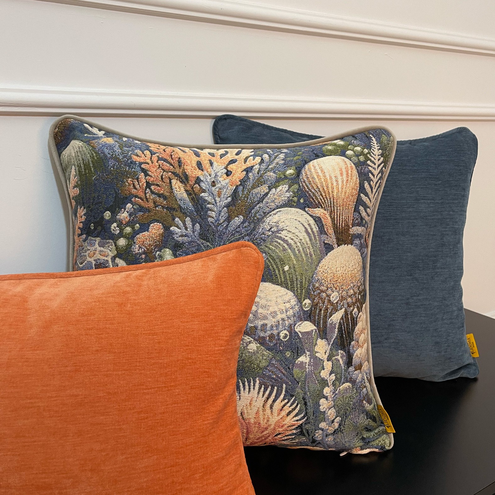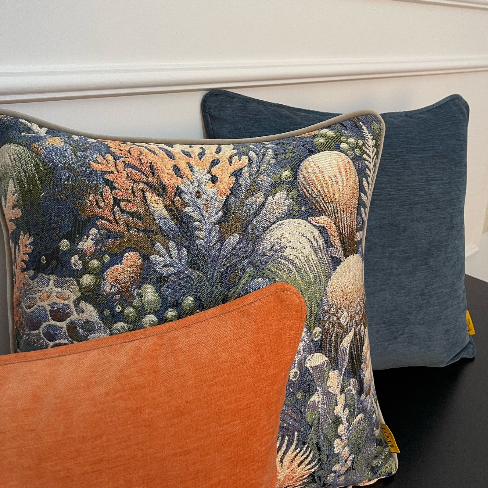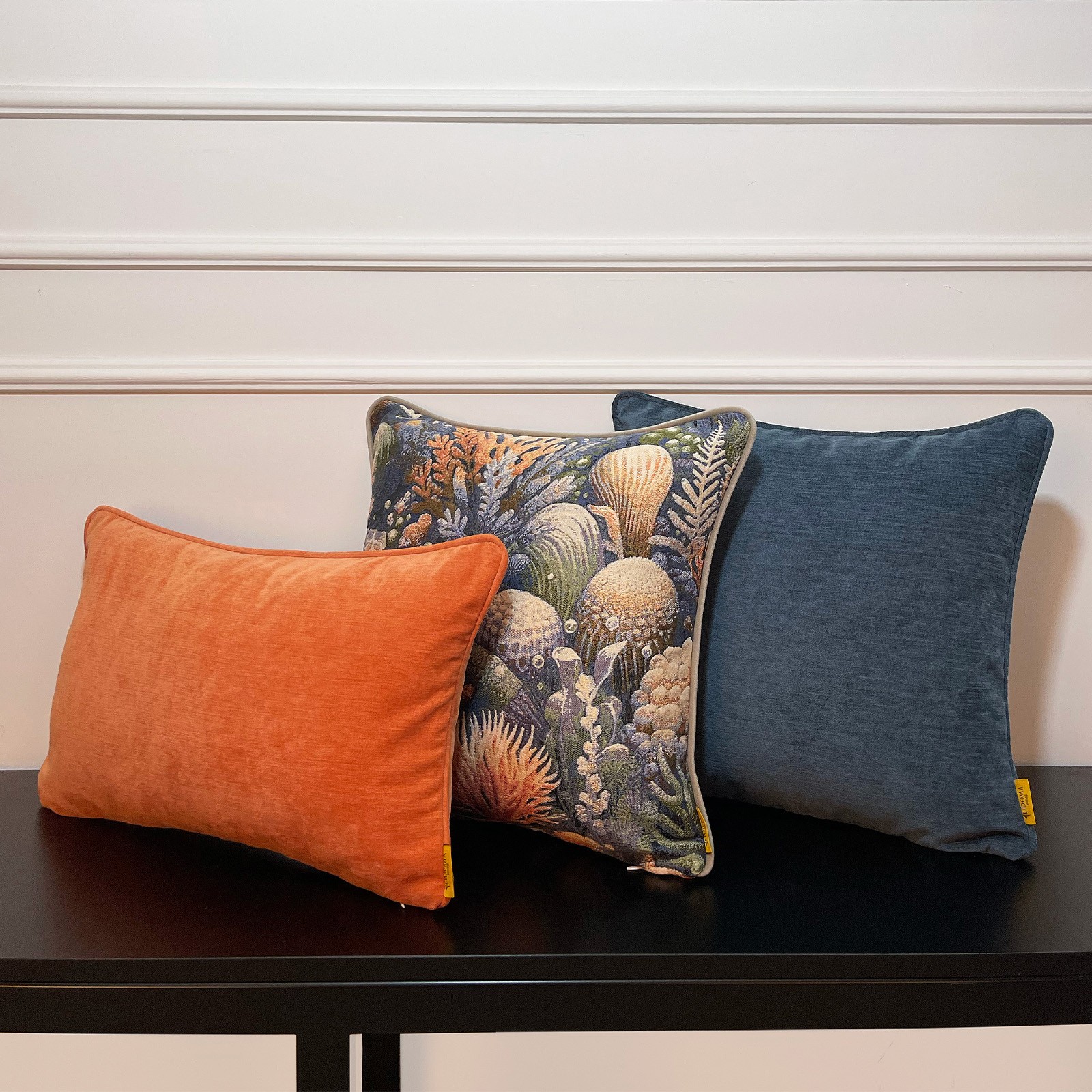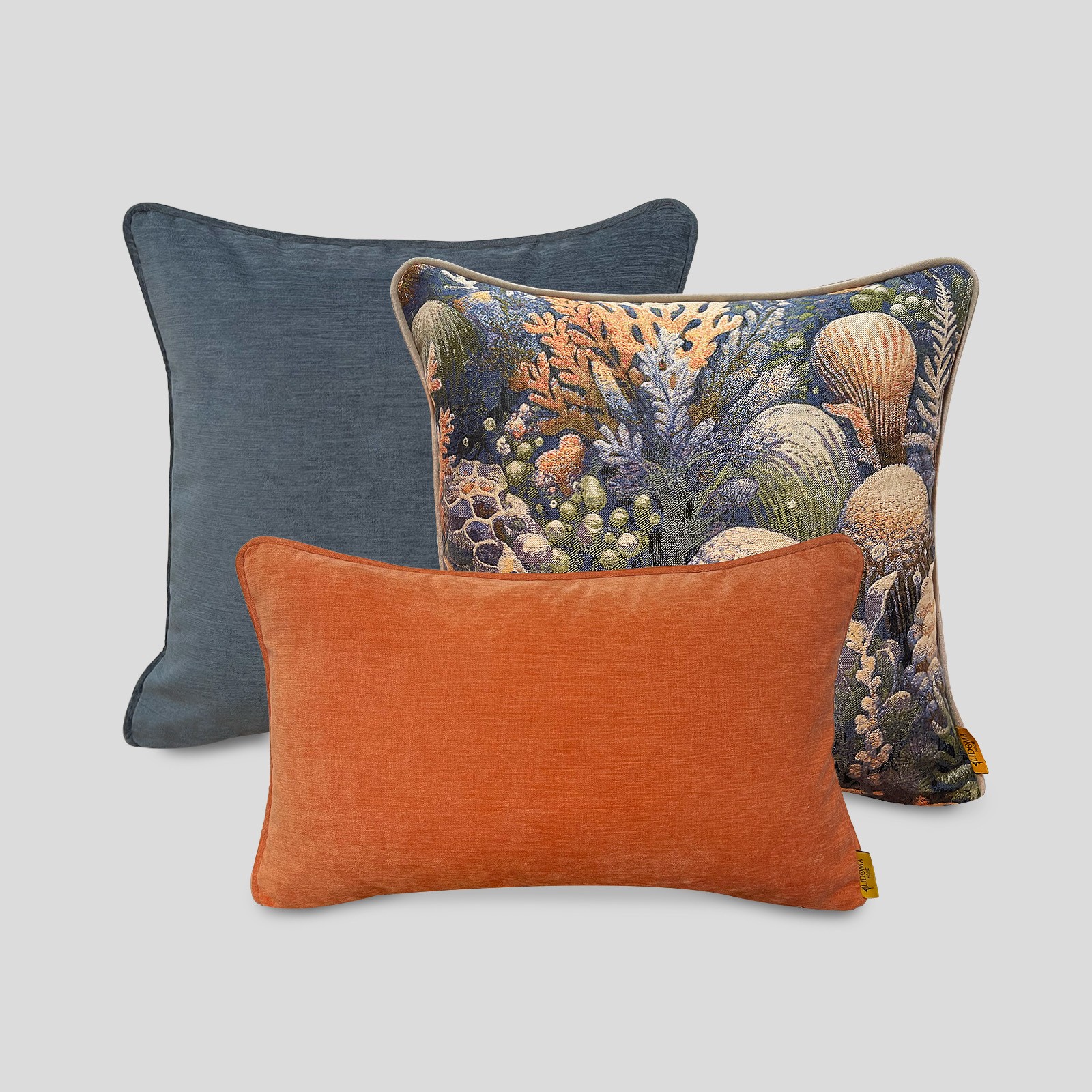Doğadan ilham, dekorasyona dönüşüyor. Okyanus altı dokularını ve mercan ilhamını taşıyan özel jakarlı pamuk desen, lacivertin asaleti ve pas tonunun sıcaklığıyla bir araya geliyor. Ocean Rust kırlent seti, hem enerjik hem dengeli görünümüyle yaşam alanlarınıza sofistike bir doğallık katıyor.