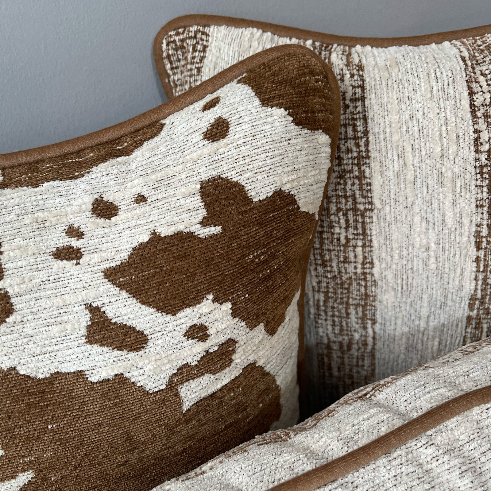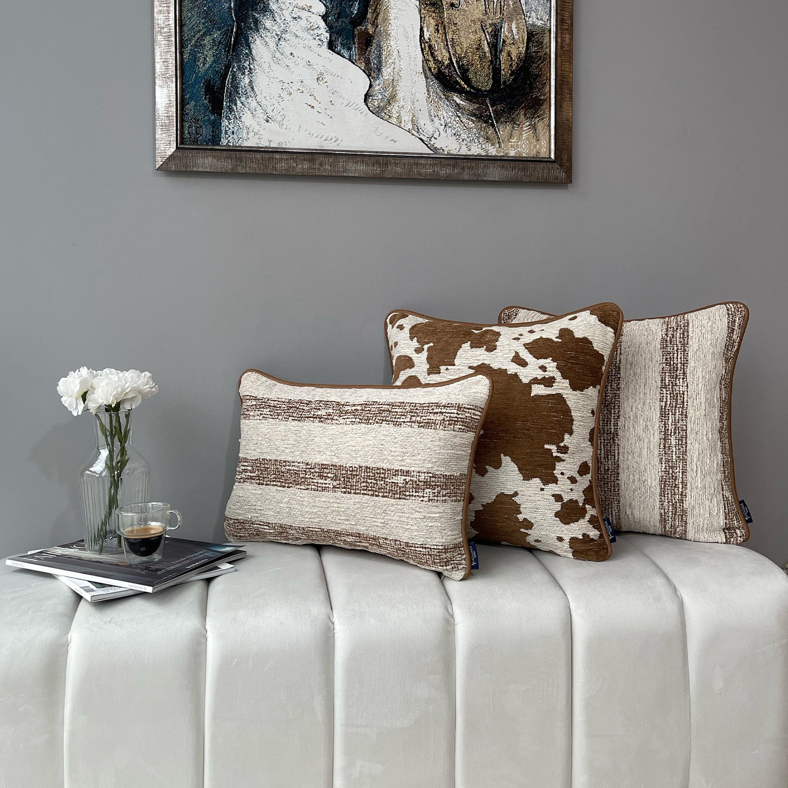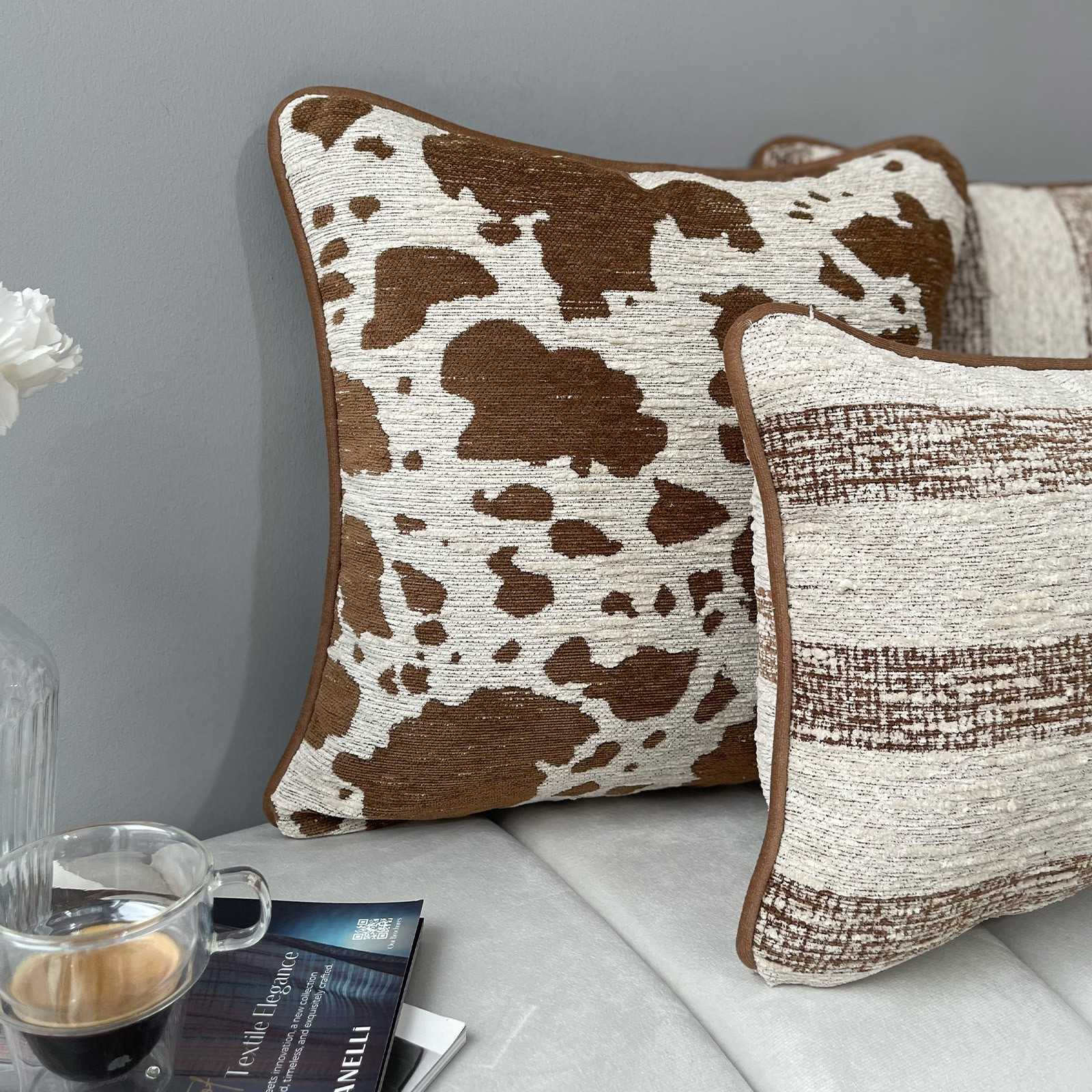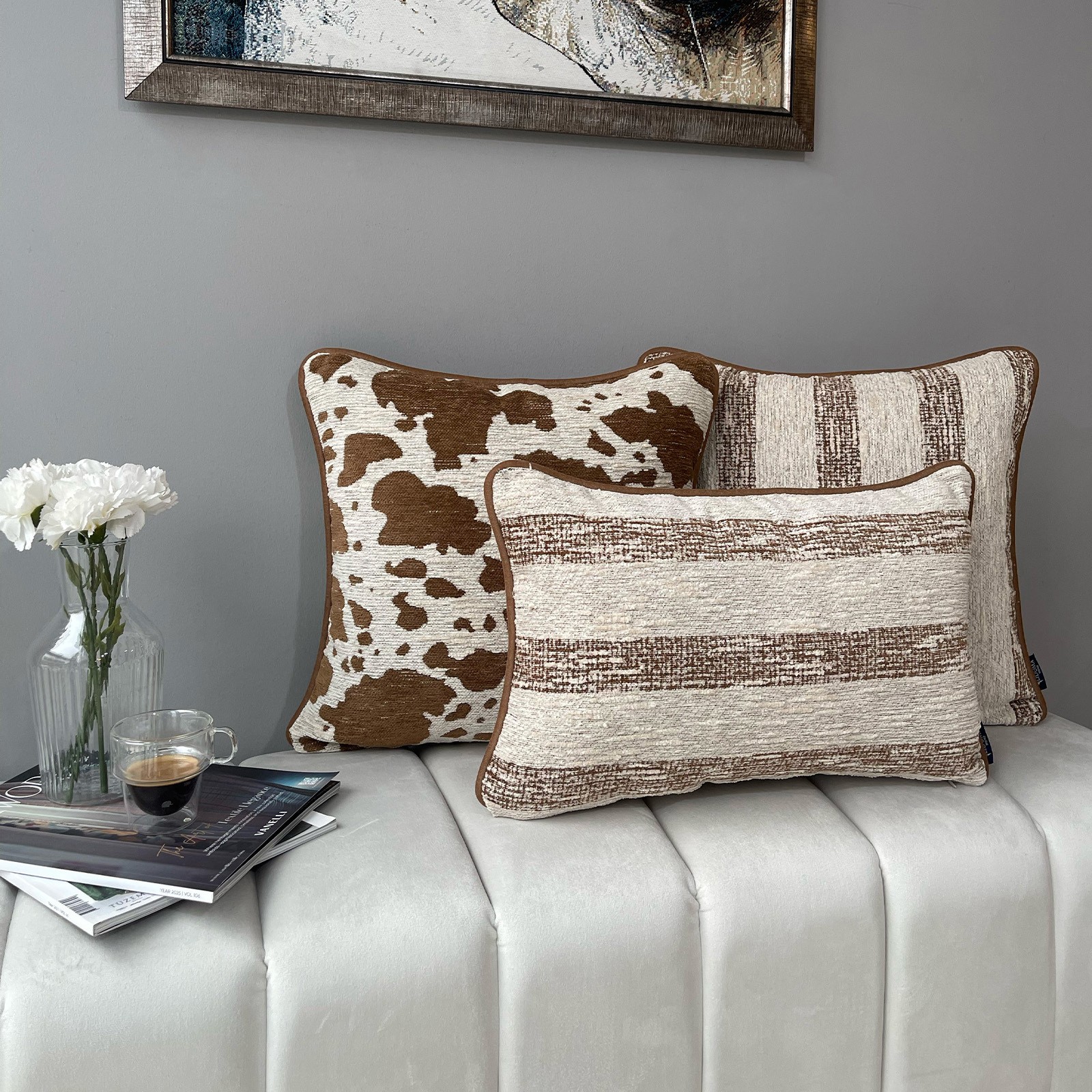Spot & Warm, doğal desenlerin sıcak tonlarla buluştuğu, yaşam alanlarına karakter katan özel bir kırlent serisidir. Benekli dokusu ve çizgisel yüzey detaylarıyla modern rustik bir etki sunarken, kahve ve krem tonlarının dengeli uyumu sayesinde mekâna sıcak ve davetkâr bir atmosfer kazandırır. Dokulu kumaş yapısı hem görsel hem de dokunsal olarak zengin bir his yaratır. Koltuk, berjer veya yatak üzerinde tek başına kullanılabileceği gibi farklı kırlentlerle kombinlenerek güçlü bir dekoratif vurgu sağlar. Günlük kullanıma uygun, zamansız ve kolay uyumlanan tasarımıyla dört mevsim tercih edilebilecek bir üründür.
